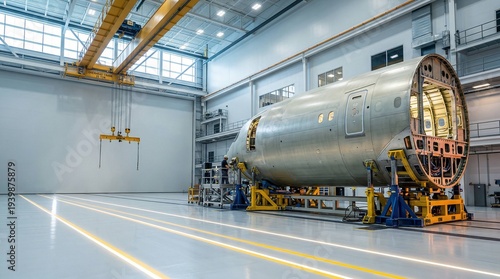 Aircraft fuselage section inside modern industrial hangar with high ceiling and large windows, advanced manufacturing equipment and spacious clean floor for aerospace assembly.