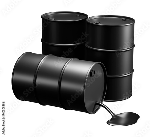 Black oil barrels with spilled crude oil isolated on transparent background 3D render
