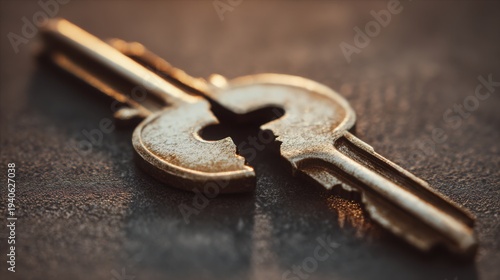 macro photography of a broken key split in half, symbol of lost opportunity or inability to access something important, soft blurred background
