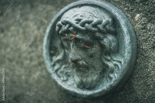 Kamienny medalion z wizerunkiem Chrystusa w koronie cierniowej na starym nagrobku. Detal rzeźbiarski pełen symboliki religijnej i nastroju kontemplacji na cmentarzu.