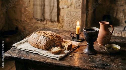 A rustic wooden table setup for Maundy Thursday dinner with bread wine and candle