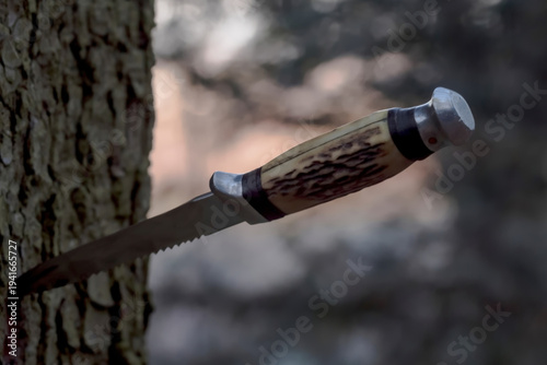 Nóż ze stałym ostrzem -z ząbkowaną krawędzią- wbity w pień drzewa o szorstkiej teksturowanej korze. Rękojeść ma lekki, przypominający poroże wzór z ciemnymi akcentami a metalowa skuwka jest widoczna