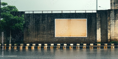 Rain falls upon concrete wall, blank billboard visible. Wet road reflects light, trees present. Gloomy weather conditions dominate scene.