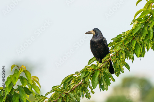 Gawron siedzący na gałęzi drzewa owocowego na tle jasnego nieba. Portret ptaka z rodziny krukowatych w naturalnym środowisku. Dzika przyroda, ornitologia i ekologia w mieście.