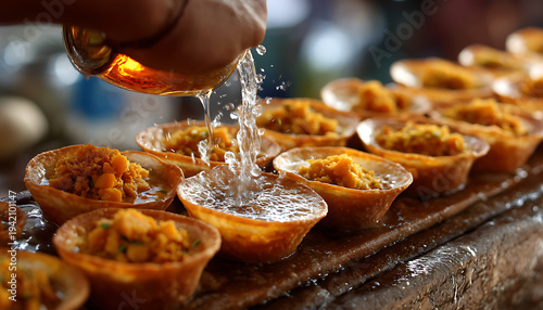 Crispy puris filled with spiced potato burst with tangy flavored water capturing the lively essence of indian street food pani puri