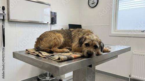 scruffy terrier lies curled on a stainless steel exam table in a veterinary clinic. a blanket cushions the dog and daylight creates a subdued mood