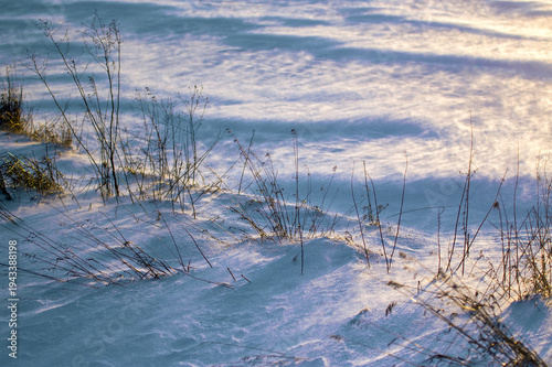 Krajobraz kompozycja zimowa sceneria trawy śnieżny puch, zawieja śnieżna.