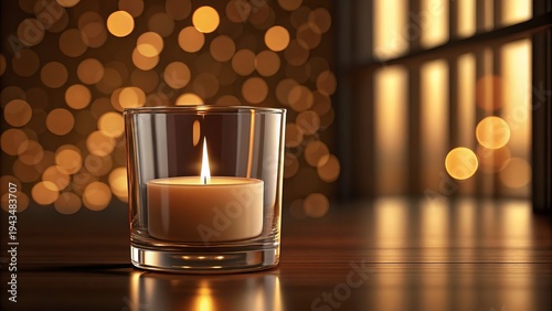 Glowing Candle in Glass Holder with Warm Bokeh Lights Background, Romantic Ambiance and Peaceful Mood, Evening Glow