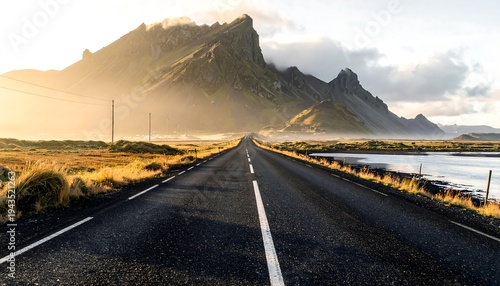 A straight, black asphalt road leads toward imposing mountains, kissed by the golden light of the sun. The landscape is mostly flat