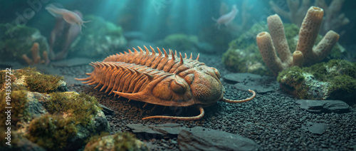 Ancient marine trilobite rests on the ocean floor in prehistoric habitat A prehistoric trilobite resting on the ancient seabed underwater