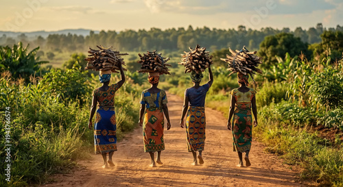 Four women carrying firewood on their heads walk down a dusty rural path at sunset