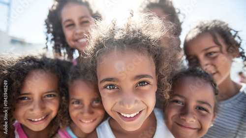Happy young children, mostly girls, smiling directly at camera, showing unity, innocence, and cheerful togetherness