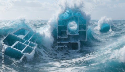 Ocean waves blueprint fusion of nature and design chaos meeting human order in surreal architecture flowing through water’s unpredictability and structural imagination