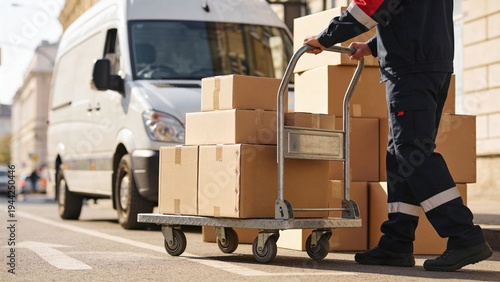 A delivery worker pushes a cart loaded with cardboard boxes on a city street. A delivery van is parked nearby, indicating a logistics operation.