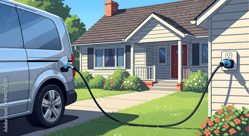 Electric Van Charging at Suburban Home with Green Lawn and Sunny Sky