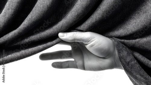 Hand Reaching Behind Dark Curtain Revealing Mystery and Intrigue.