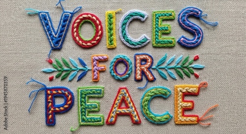 Colorful Embroidered 'Voices for Peace' Text with Decorative Stitches and Leaves