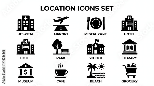 A comprehensive collection of diverse black glyph location icons designed for mapping applications, offering essential place markers for various public and commercial establishments and services.
