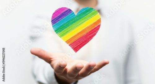 A person holding a colorful rainbow heart in their hand with a blurred white background