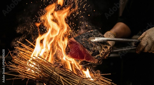 Cooking photo material of bonito grilled in straw grill/藁焼きで炙るかつおたたきを写した料理写真素材