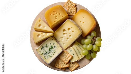 Isolated elegant cheese board with assorted gourmet cheeses, crisp crackers, and fresh green grapes.