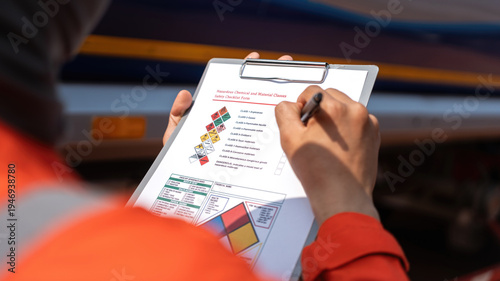 An engineer is checking on chemical hazardous material checklist to verify the safety condition with chemical road tanker as background. Industrial waorking scene, close-up and selective focus.