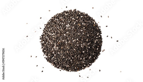 Concentric arrangement of chia seeds, mostly black, against pure white background, showcasing their textures