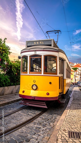 A classic yellow tram car, framed by a cobblestone street, travels under a vibrant sunset with glimpses of buildings and greenery
