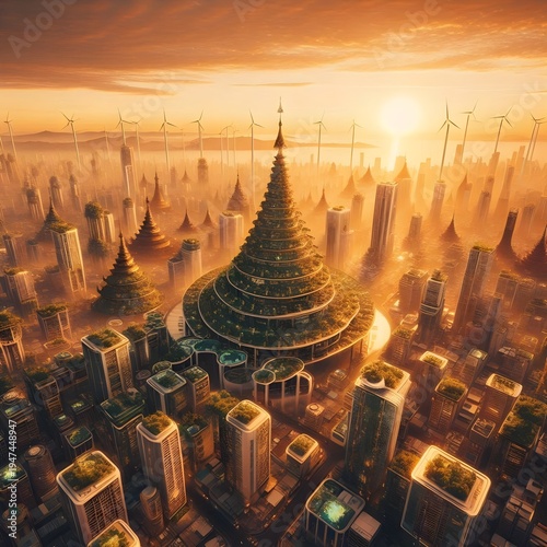 A Sustainable and Green Futuristic Cityscape at Sunset