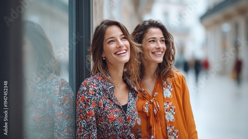 Two smiling women in stylish outfits stand close together, enjoying a moment outdoors in a vibrant urban setting.