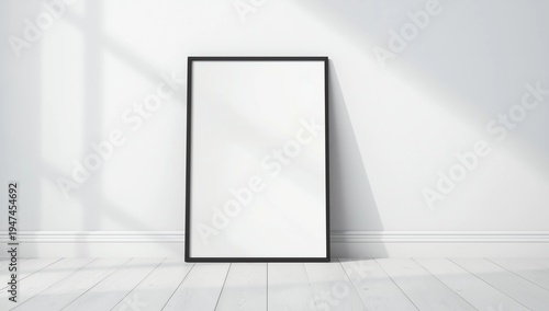 White poster with blank frame on wooden floor. Mockup for you design print.