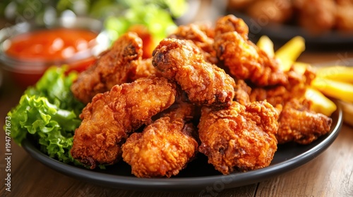 A plate of crispy, golden-brown fried chicken wings sits on a dark wooden surface. The wings are arranged with lettuce and a bowl of red sauce.