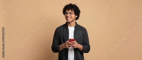Engaging young man using smartphone in casual setting lifestyle portraits warm background focused on communication and connection