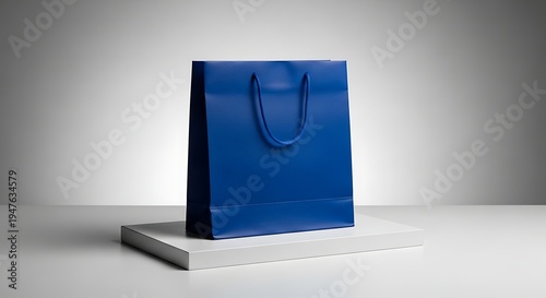 Blue leather shopping bag on pedestal.