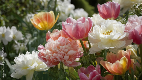 Mixed garden flowers blooming in spring, featuring colorful tulips and ranunculus creating a vibrant floral display