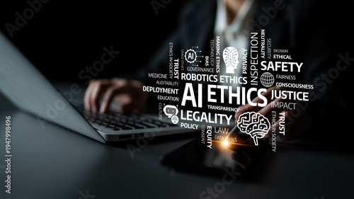 This image captures the themes of AI ethics and legality, highlighting safety, justice, and governance in technology impact on societal norms and values. Tessel