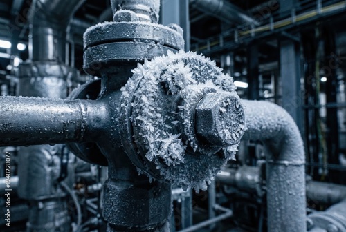 Industrial frost accumulation on mechanized piping showcasing intricate crystalline structures resistant to thermal fluctuations in an advanced cold storage environment
