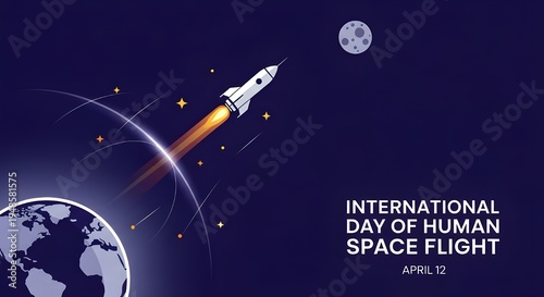 International day of human space flight graphic: rocket ascending from earth with moon with space exploration with outer space with rocket launch