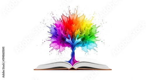 Vibrant tree emerging from open book with rainbow colors