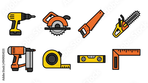 Hand and Power Tools Flat Icon Set for Construction Woodworking Projects