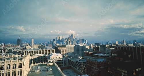 distant metropolis visible beyond layered rooftop composition, cold midday light, textured brick foreground, subdued cloudscape, urban scale and rhythm