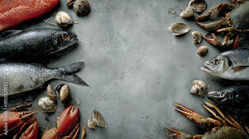 Fresh seafood assortment on a grey surface