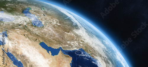 Planet Earth. Middle East. Earth at day on the starry sky. UAE, Iran, Saudi Arabia, Oman, Israel, Iraq, Syria, Pakistan, Arabian Peninsula. Asia.