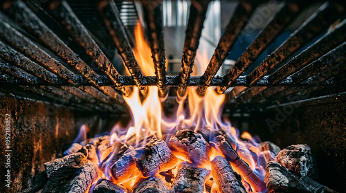 A close-up view of a grill with flames burning brightly underneath the grates on a pile of charred wood