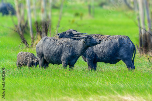 Swamp buffalo or Bubalus bubalis standing in pasture with green background, Thailand.