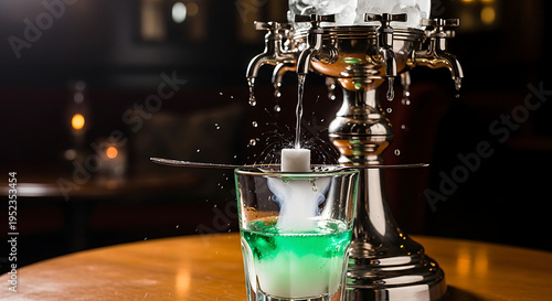 Traditional absinthe drip with ice water dissolving a sugar cube into green liquor