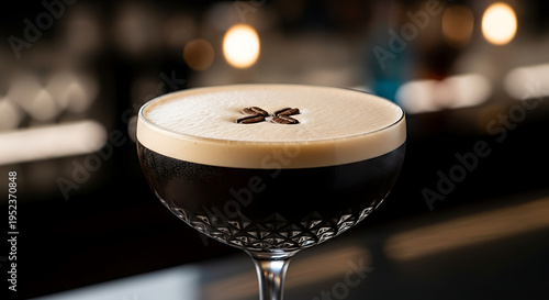 Elegant espresso martini cocktail with coffee bean garnish on a dark bar