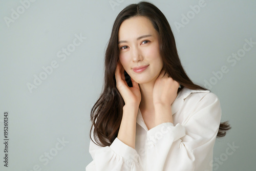 グレーバックの頬に手を当てる白いシャツを着た若い日本人女性のポートレート