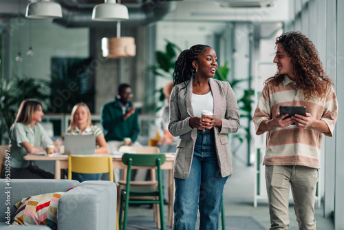 Diverse colleagues walking talking in modern office