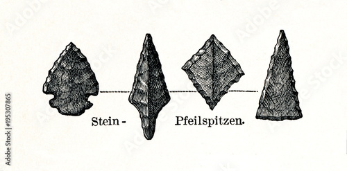 Stone arrowheads from prehistoric stilt-house settlement (from Meyers Lexikon, 1896, 13/754/755)